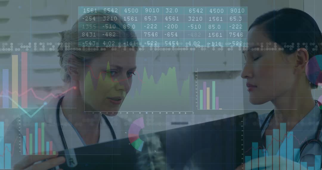 Scene depicting two female medical professionals engaged in analyzing a spinal X-ray, overlaid with digital charts and graphs, illustrating modern healthcare analytics in a clinical setting. Image useful for showcasing themes of innovative diagnostics, integration of data analytics in medicine, and highlighting professionalism in healthcare.