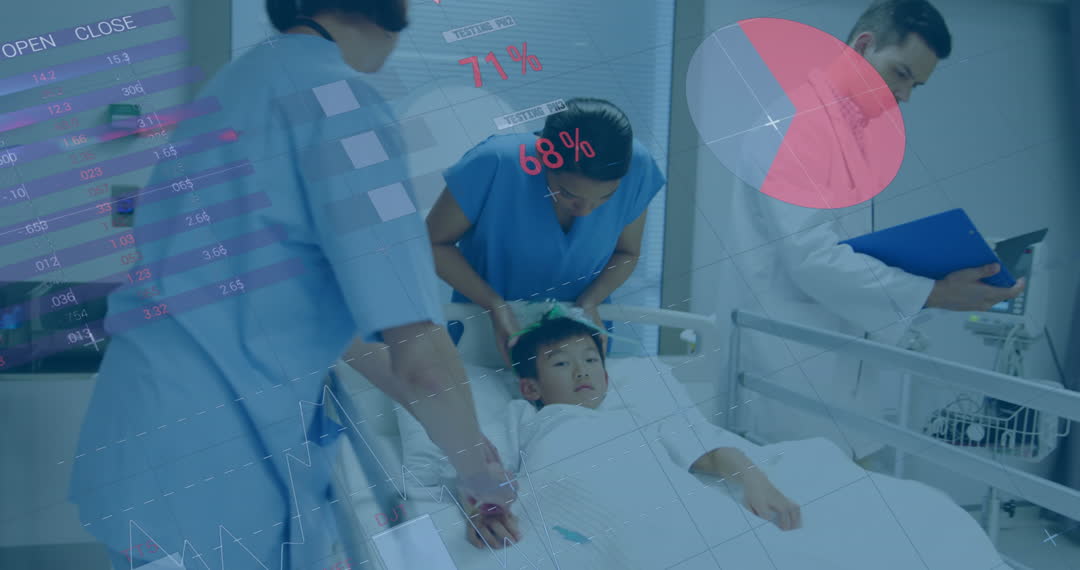 Medical professionals providing care to a child in a hospital bed, while chart and graph data projected onto scene symbolizes integration of digital technology and healthcare. Ideal for illustrating themes in medical innovation, data-driven health strategies, teamwork in healthcare visual media, and child patient care concepts.
