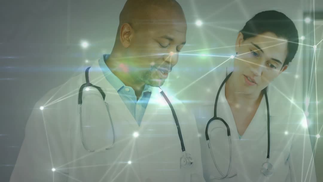 Two doctors engaging in collaboration while reviewing a medical plan, enhanced with a digital network overlay. This video conveys the merging of technology and healthcare, suggesting advancements and innovations in medical communication and teamwork. Useful for illustrating themes in health technology, modernization in medicine, and professional collaboration.