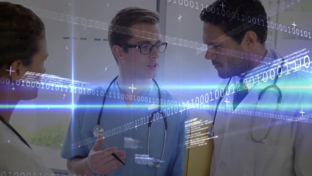 Doctors Collaborating with Digital Technology and Binary Code Overlay Video