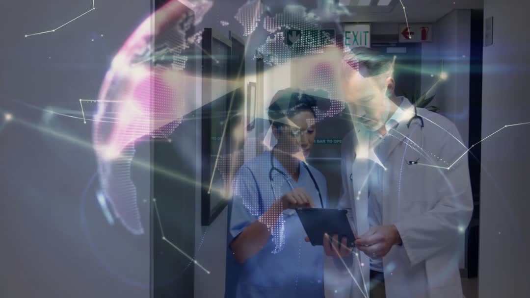 Healthcare professionals engaged in discussing patient data on a digital tablet, with a conceptual holographic globe representing global connectivity and advanced technology overlay. Ideal for illustrating themes of advanced medical technology, digital transformation in healthcare, and global medical collaborations.
