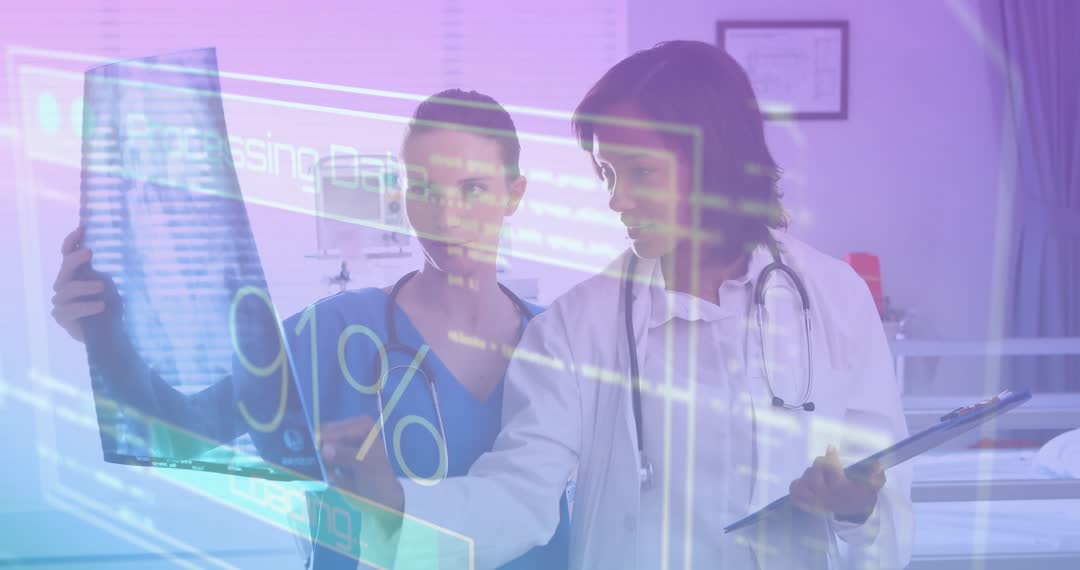 Video distance features doctors working together in clinic holding an X-ray film overlay filled with digital processing visuals. Fits scenarios emphasizing intersection of healthcare with digital technology and data analysis. Ideal for content depicting modern diagnostics, healthcare innovation, or collaborative clinical environments.