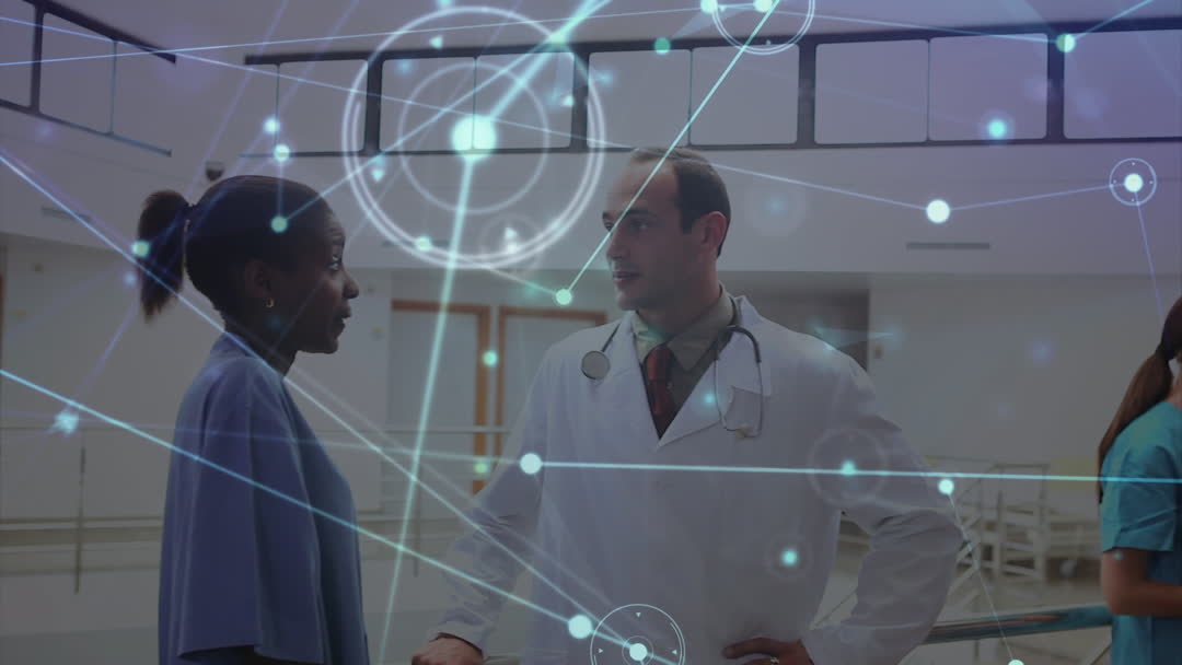 Healthcare professionals engage in meaningful conversation with digital data overlay suggesting a discussion on technological advancements in expertise. Ideal for projects focusing on modern medical technology, healthcare innovations, and global communication in the medical field.