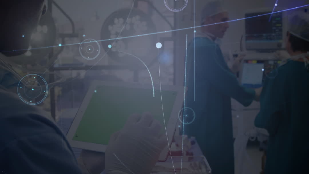 - Doctors Using Tablet with Digital Network Overlay in Operating Room