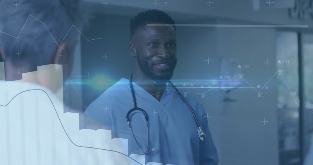 This depiction of two doctors discussing a plan in a hospital environment emphasizes teamwork and modern healthcare practices. The animated medical chart overlay symbolizes the integration of digital analytics in medical decisions, showcasing the professionalism of a medical setting. Useful for illustrating themes of teamwork in healthcare, digital transformation in medicine, or the role of analytics in patient care.