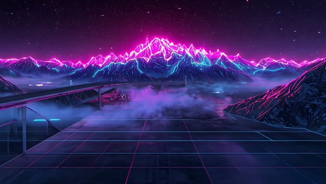 AI Generated Image. Camera dollying forward, revealing neon-lit mountain ridge and glowing grid platform under starry sky, fog spreading across foreground and enhancing depth. Strong synthwave palette of magenta and cyan creating retrofuturistic mood, combining vaporwave aesthetics with modern sci-fi vibe. Ideal for background in music video intros, electronic album covers, game trailers, app splash screens, website hero banners, promotional motion graphics. Useful for concept art, moodboards, advertising for tech or nightlife events, social media campaigns seeking nostalgic yet futuristic look. Offering layering opportunities for title treatment, animated overlays, looping backgrounds; color grading and particle effects complementing neon highlights.
