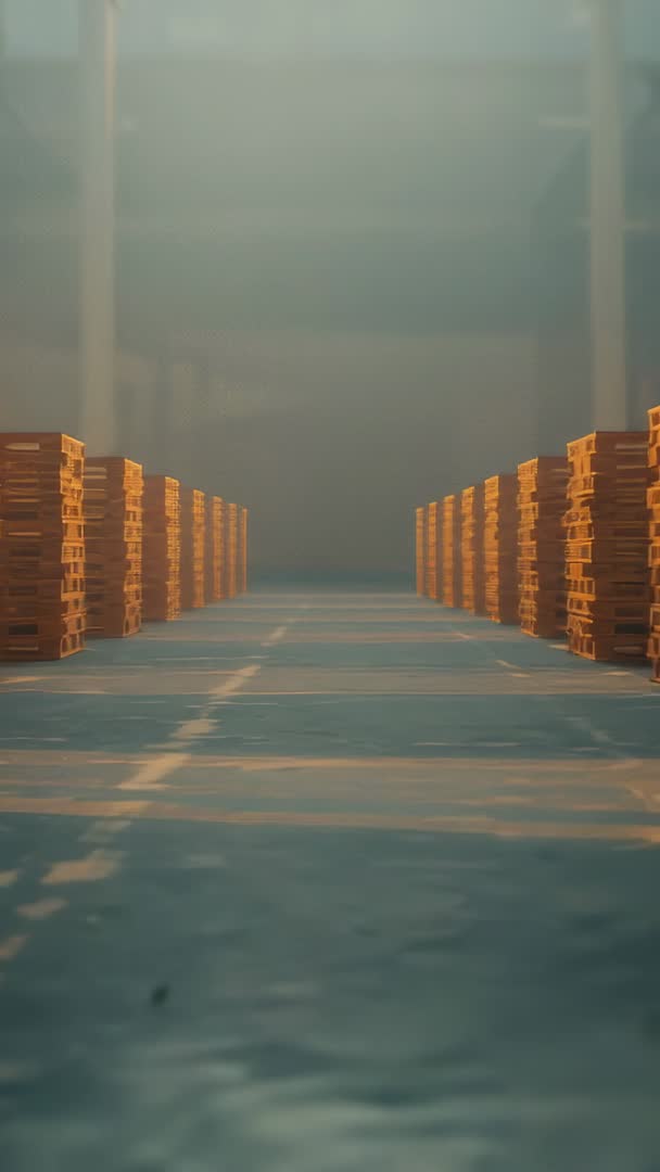 AI Generated Image. Dolly moving through symmetrical warehouse aisle, revealing stacked wooden pallets and dusty concrete floor with tall support columns. Warm golden light casting long shadows, enhancing perspective and cinematic depth. Footage focusing on empty industrial space and storage geometry, creating moody, contemplative atmosphere. Suitable for logistics, supply chain, inventory management, warehouse safety, industrial and manufacturing projects. Perfect for vertical social media content, reels, stories, mobile ads, app backgrounds, hero sections for logistics websites, corporate presentations, and documentary openers. Technical suggestions: vertical 9:16 orientation, slow dolly speed for smooth reveal, subtle color grade boosting warm highlights and controlling shadows, optional slow-motion retiming or looping for background use, safe space on upper third for overlay text or logo.