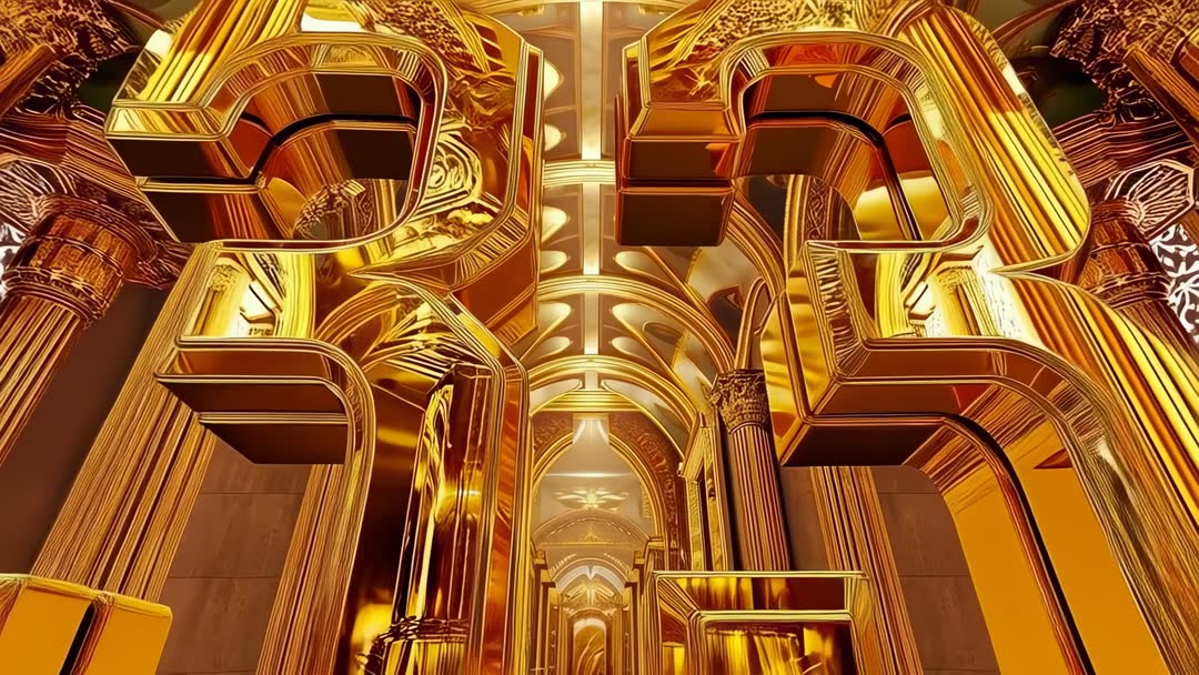 AI Generated Image. Dolly panning forward through gilded hall, revealing oversized hollow numeral 33 framed by ornate neoclassical columns and vaulted arches. High gloss gold surfaces reflecting warm light, creating mirrorlike depth and repeating geometry as camera is moving. Cinematic motion and perfect symmetry supporting dramatic reveal for title sequence, luxury brand promo, event opener, or broadcast bumper. Visuals suiting fashion films, tech product launches, music video backdrops, advertising campaigns, and social media teasers. File presenting AI generated artistry with polished reflections and monumental scale, allowing editors to crop, loop, time remap, or integrate motion graphics for custom intros and transitions.