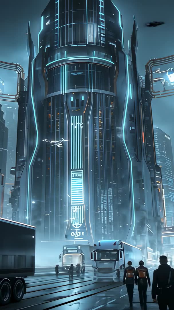 AI Generated Video. Vertical video showing dolly move revealing neon-lit tower rising above foggy cyberpunk boulevard, commuters wearing hi-vis coats walking toward base, trucks rolling past, drones hovering overhead. Lighting featuring cyan and magenta neon accents, reflections on wet streets, light haze adding depth and motion. Suiting corporate video openers, tech startup promos, urban future concept reels, science fiction trailers, smart city documentary sequences, product showcases for autonomous transport, music video backgrounds and commercial spots. Offering editing suggestions including slow dolly timing, color grading emphasizing neon cyan and teal, adding ambient synth and distant traffic for immersive soundscape. Optimizing for mobile and social platforms, ideal for Instagram Reels, TikTok, vertical ads and widescreen crop alternatives.