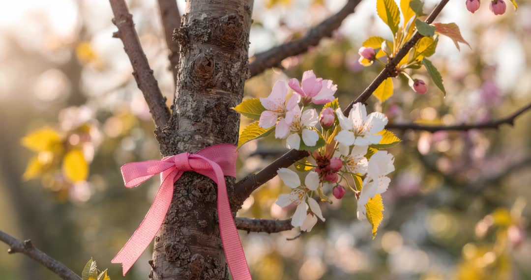 AI Generated Image. Camera moves gracefully towards tree trunk adorned with pink ribbon, beautifully highlighting blossoms in orchard. Perfect for themes of renewal and celebration. Ideal for springtime events, gardening inspiration, or tranquil nature scenes in media projects.