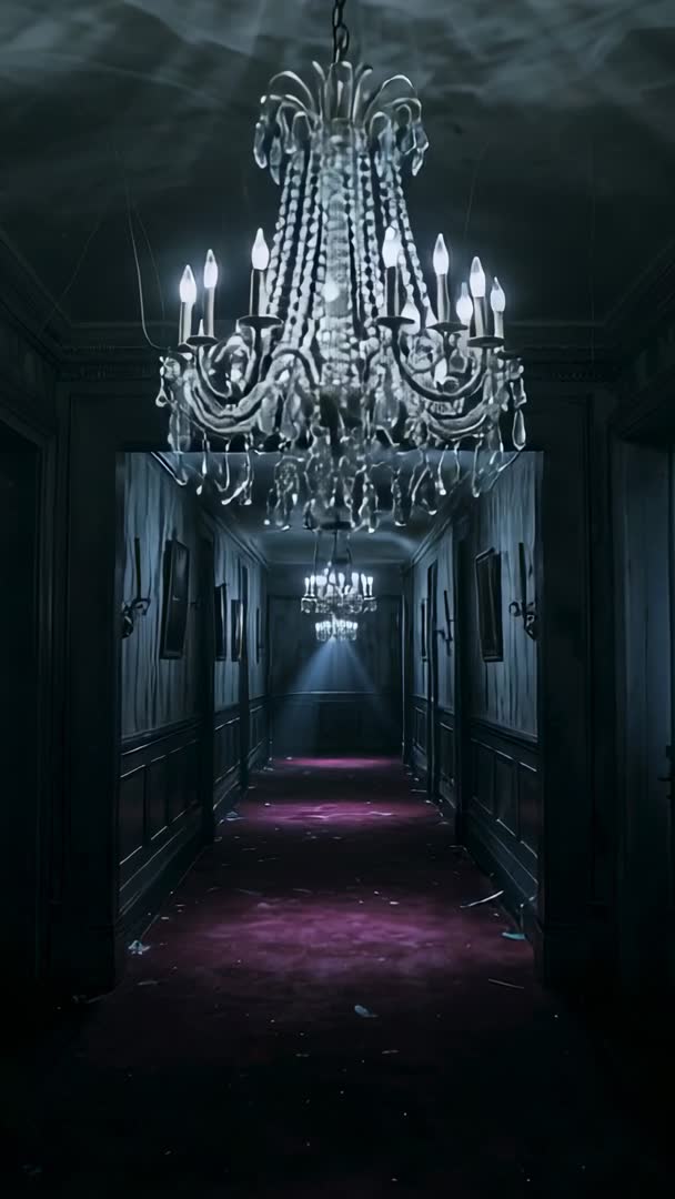 AI Generated Video. Camera dollying forward through dimly lit vintage mansion corridor while crystal chandelier glowing and casting fragmented light across deep red carpet. Cool blue highlights and narrow beams of light creating atmospheric, cinematic mood with subtle dust motes drifting and scattered debris suggesting aged grandeur. Repeating chandeliers and strong central depth yielding smooth forward motion ideal for slow reveal or tension build. Use as opening shot for thriller, period drama, music video, or fashion film to establish luxury and looming mystery. Work for luxury hotel promo, heritage property showcase, interior design reel, streaming title sequence, or vertical social ad on Instagram Stories and TikTok. Edit-friendly composition enabling seamless cuts, speed ramps, looping, and title overlay. Color grading tips: enhance cool highlights, deepen shadows, add subtle film grain for vintage feel. Licensing suggestions: commercial and cinematic uses, background b-roll, mood-setting intro, and promotional campaigns.