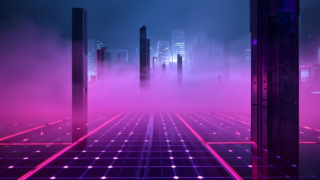 - Dollying forward over neon grid revealing magenta fog, cyberpunk pillars, distant city glow