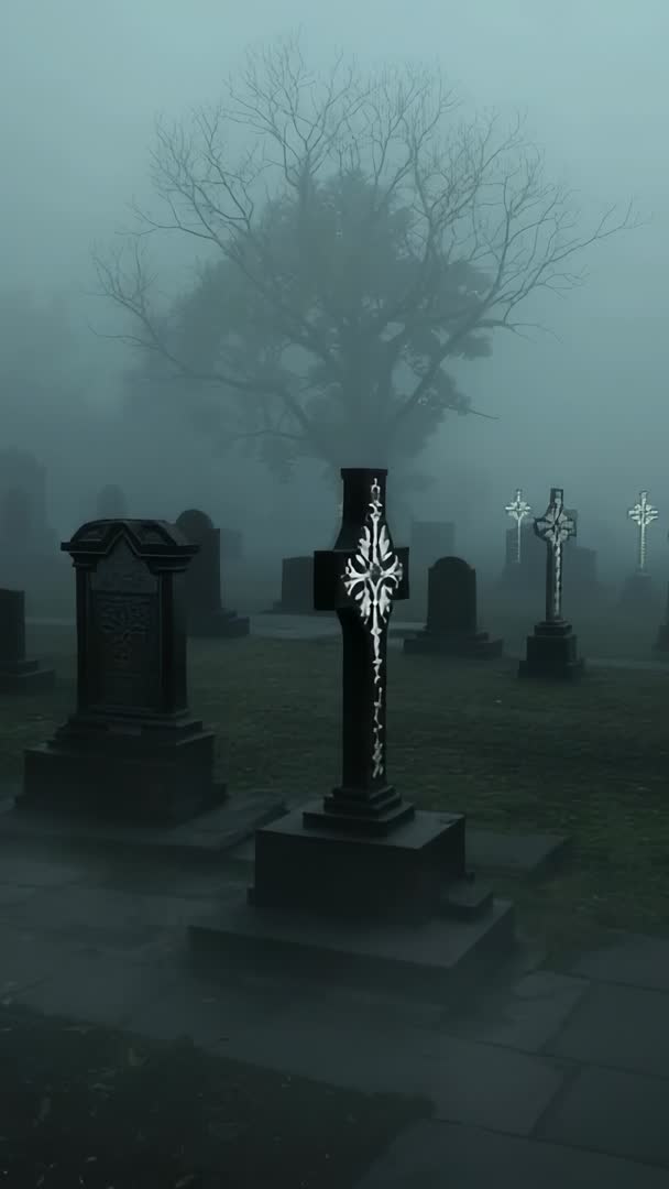 AI Generated Image. Camera dollying along foggy cemetery path, revealing ornate black cross engraved with silver filigree. Fog drifting low over mossy ground, tall bare tree looming in background, tombstones fading into mist. Mood conveying gothic, haunting, melancholic atmosphere with muted teal-green color grading. Shot composing vertical frame for seamless use in social platforms, stories, reels, vertical ads. Ideal for horror opener, Halloween campaign, gothic music video, documentary segment on memorial culture, funeral tribute montage, novel trailer, podcast visualizer. Perfect for overlaying text, title cards, logo reveal, slow fade transitions, cinematic intro sequences. Licensing suggestions: background footage, B-roll, stock clip for mood-driven storytelling and promotional content.