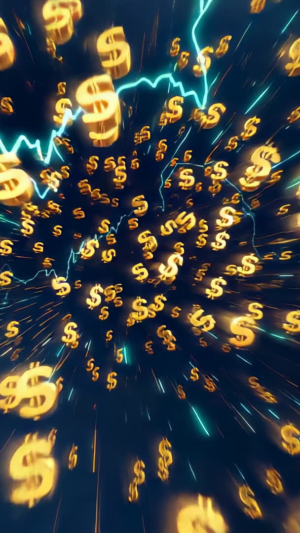 AI Generated Video. Vertical 9:16 video showing camera dollying through neon tunnel of glowing golden dollar symbols while pulsing teal market line streaks across frame. Heavy motion blur and layered depth cues creating sensation of rapid movement through digital currency field. Serving as looping background for vertical ads, Reels, Shorts, 9:16 hero screens, landing page hero, title reveal, lower-third animation, broadcast opener, or social media promo. Color palette combining warm golds with cool teal offering high contrast for superimposed text and graphics. Render optimized for vertical delivery and loop-friendly composition enabling seamless repeats. Allowing easy speed ramping, audio sync, and integration with motion graphics templates for fintech promos, investment pitch clips, market update videos, crypto explainers, or brand campaign intros.