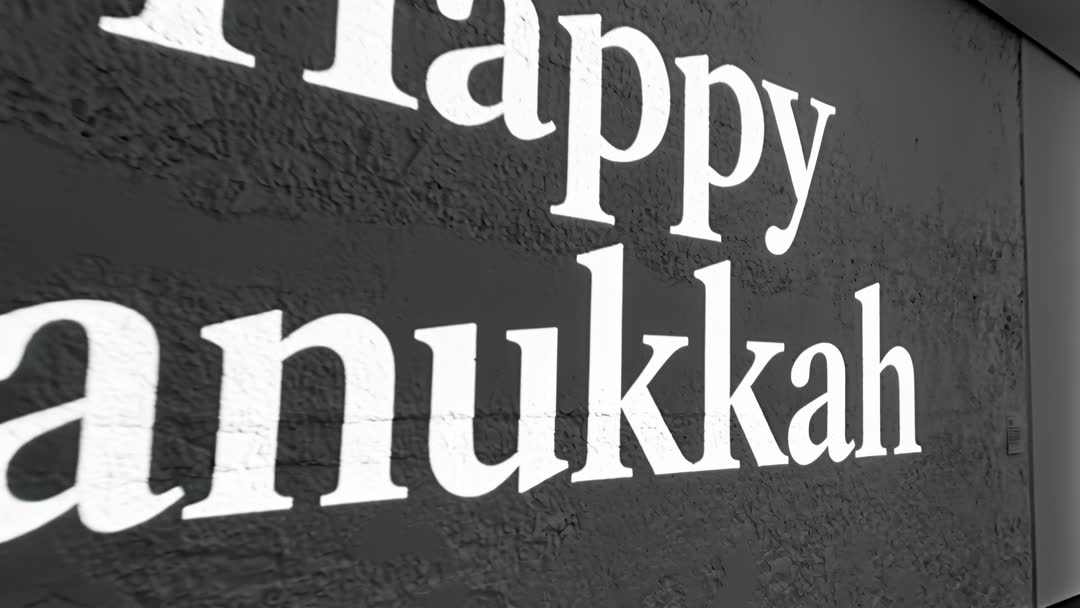 - Dollying through textured corridor zooming on Happy Hanukkah projection and menorah closeup