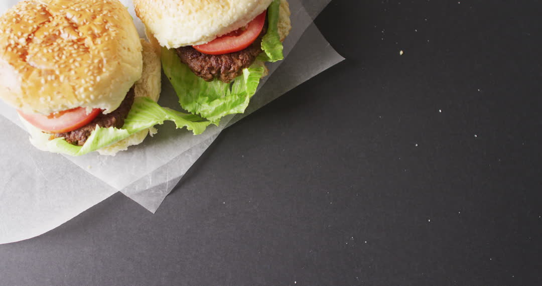 Juicy, homemade burgers with sesame buns, lettuce, and tomato slices pictured from overhead. The dark background with copy space offers a versatile option for various designs and advertisements, especially for restaurant menus, food blogs, and culinary presentations. Ideal for showcasing fast food themes and DIY cooking ideas.