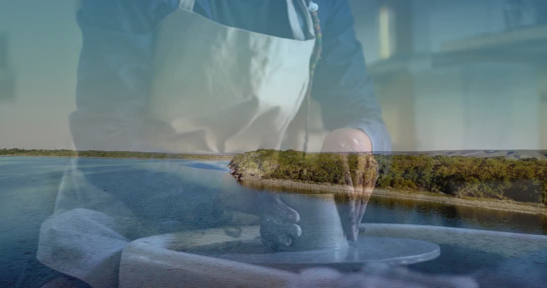 Double Exposure Art of Potter Crafting Clay by Tranquil Water Video