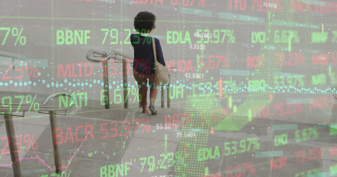This artistic composition showcases a child walking down steps while talking on a cellphone, overlaid with stock market percentages and graphs. Suitable for themes related to finance and technology, displaying contrasts between daily life and digital economic systems. Ideal for use in publications or presentations about financial literacy, technological impacts on society, or modern life contrasts.