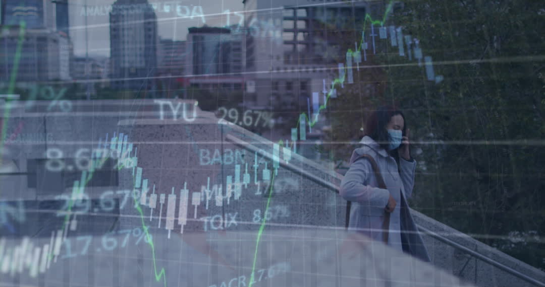 Depicts businesswoman with financial charts superimposed against city backdrop. Ideal for content related to finance, economics, urban development, or the impact of modern technology on city life and global markets.