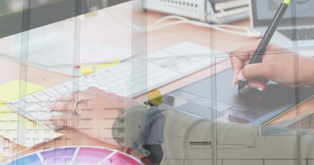 Double exposure features businesswoman using tablet blending with video of a male worker in a hard hat. Suitable for illustrating concepts of dual roles in modern work environments, technology and manual labor integration, and collaborative innovation across industries.