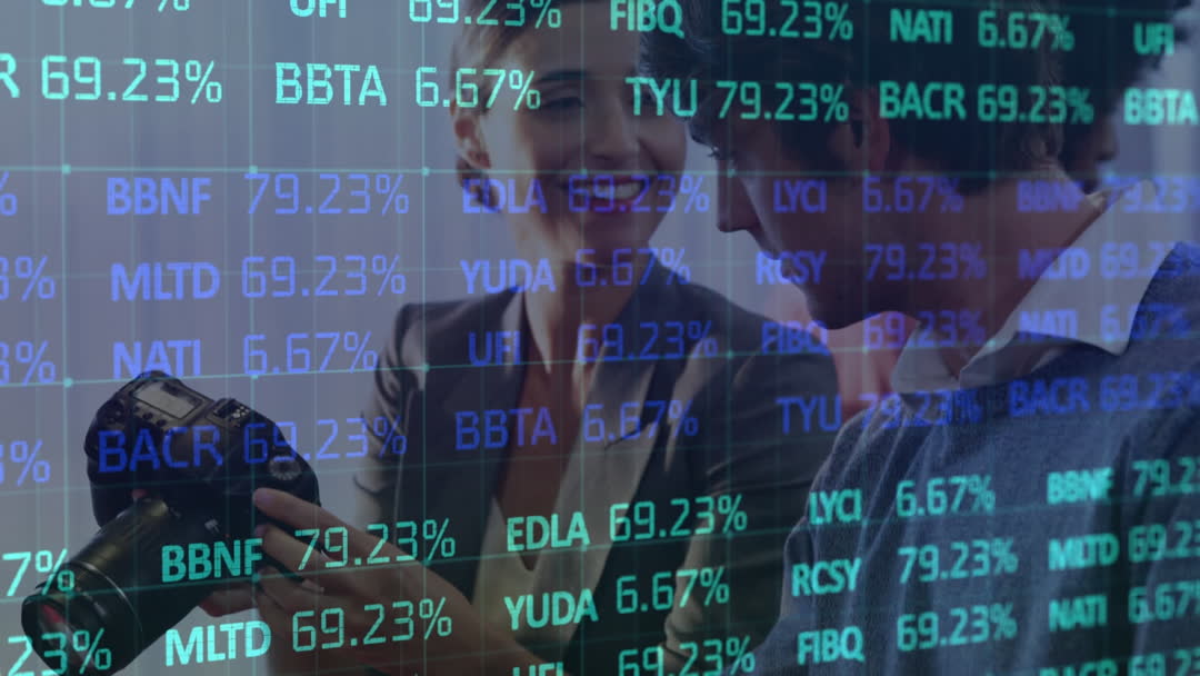 Conceptual digital display featuring abstract stock market data intertwined with an office setting where team members are engaged in reviewing photographs. This video symbolizes the convergence of creative collaboration and financial analysis, suitable for use in technology, finance, or stock videory promotions. It highlights themes of teamwork, business intelligence, and innovative workflow among colleagues. Likely applications include marketing materials, presentations on workplace collaboration, and investment or corporate themed content.