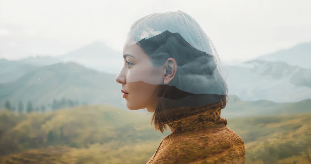 - Double Exposure of Reflective Woman and Mountain Serenity
