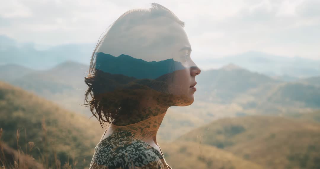 - Double Exposure of Woman's Silhouette and Mountain Peaks
