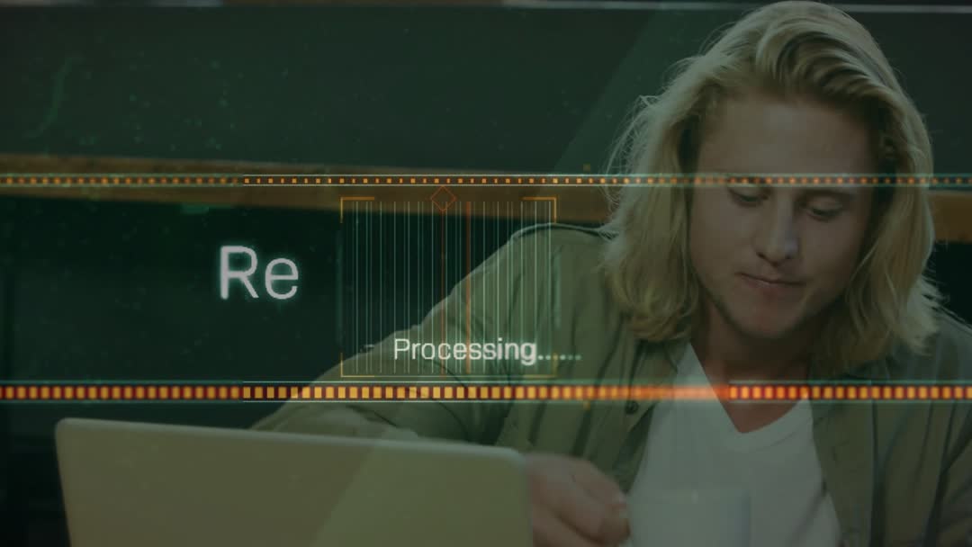 A young man places his laptop and coffee on a table as a digital file is being processed. The holographic overlay signifies information transfer or cloud storage. This visual is useful for depicting modern digital skills, remote work, and productive collaboration in tech or educational content.