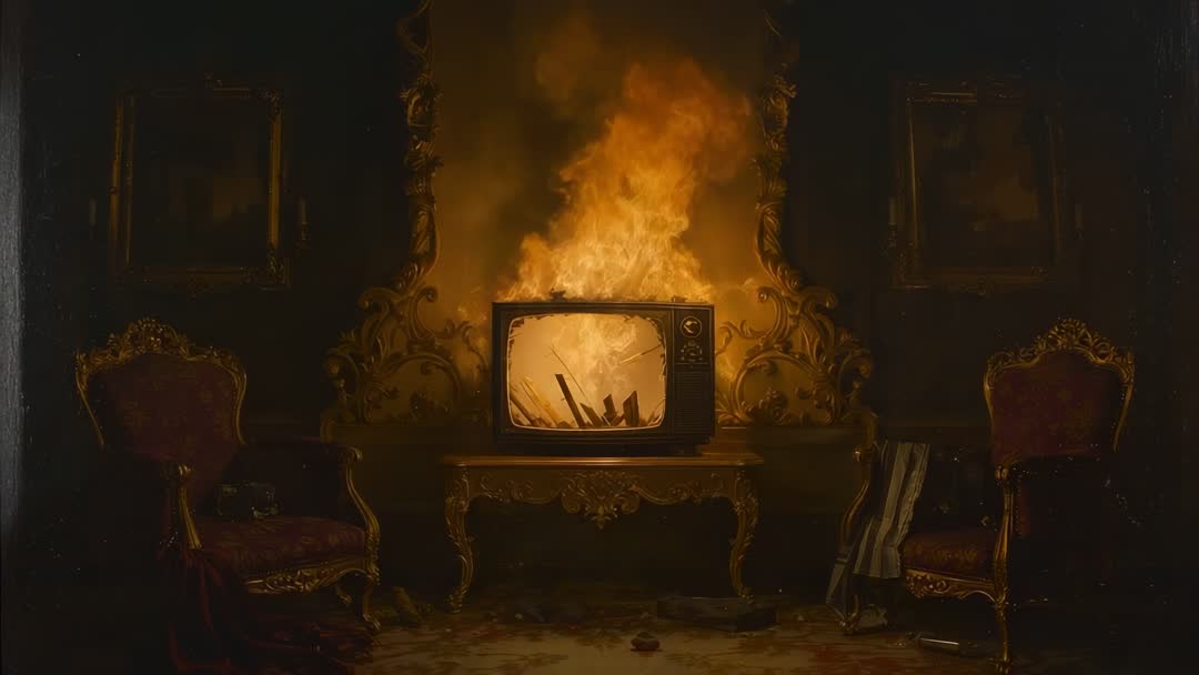AI Generated Video. Intense scene of fire engulfing a vintage TV set, surrounded by luxurious antique furniture in an elaborate parlor. Flames dramatically rise, consuming objects and creating a compelling visual of decay amidst once-grand decor. Ideal for use in storytelling or dramatic artwork, illustrating themes of destruction versus elegance.