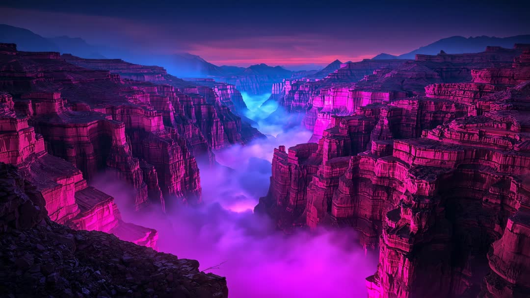 AI Generated Image. Video showing vast stratified canyon bathed in neon magenta light, with thick fog rolling through gorge and pulsing cyan-blue glow rising from depths at twilight. Camera panning slowly across layered sedimentary cliffs, revealing dramatic textures, deep shadows, and contrasting color palette blending warm magenta and cool blue tones. Atmosphere feeling otherworldly, cinematic and dreamlike, with intense color saturation and soft mist creating depth and motion. Suggested uses: use as cinematic backdrop for sci-fi trailers and film openers; use as visual element for music video backdrops or live VJ loops; use for album covers, poster art, and social media banners; use for technology or fashion advertising seeking bold, futuristic aesthetic; use for website hero banners, presentation slides, or immersive VR and ambient visualizers. Ideal for creative projects needing surreal, colorful landscape footage and strong emotional impact.
