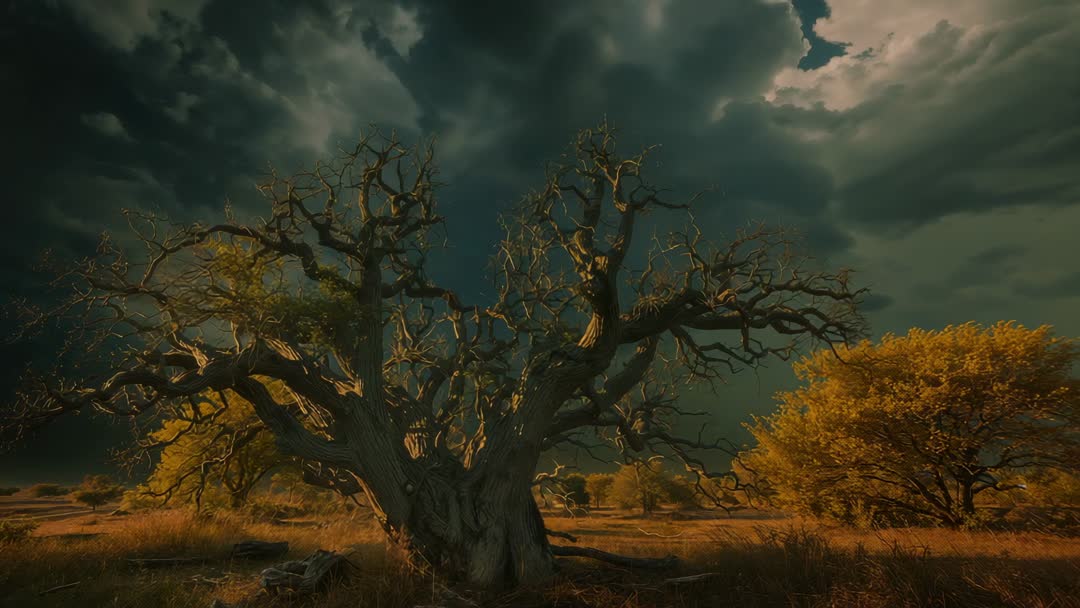- Dramatic Storm Encounter at Lone Gnarled Tree in Grassland