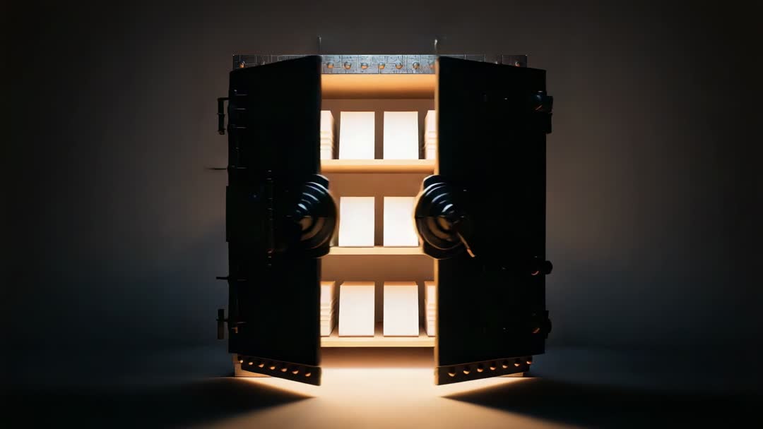 AI Generated Image. Video showing heavy metal safe doors opening slowly and revealing glowing stacked blocks on illuminated shelves, creating cinematic reveal with warm interior light against dark exterior. Scene evoking themes of security, hidden assets, data protection, treasure discovery, and working well for finance, banking, cybersecurity, and thriller content. Using clip as intro for fintech presentations, background for website hero banners, opener for corporate or documentary segments, or visual metaphor in articles about asset protection and secure storage. Editing tips: adding subtle mechanical sound effects for wheel turning and latches releasing, applying slow zoom or slight camera pan for added tension, looping seamlessly for 5–15 second hero backgrounds, and placing lower-third text or logo in dark side margins to preserve central glow. Color grading suggestion: enhancing warm interior glow and deepening surrounding shadows for dramatic contrast. Suitable for commercial, editorial, and corporate licensing.
