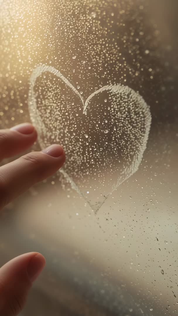 AI Generated Video. Short vertical clip showing small hand tracing heart on fogged glass, forming clear heart shape from condensation droplets. Backlit warm light creating golden bokeh and soft glow, focusing close-up on fingertip and texture of droplets. Mood conveying intimacy, romance, nostalgia and tender longing. Serving well for social media reels, TikTok, Instagram stories, Valentines Day content, romantic ads, greeting card video, blog headers, app splash screens and mood-setting background for quotes or messages. Allowing space for text overlay in upper or lower frame. Suggesting color grading with warm tones and soft contrast. Supporting slow motion playback to emphasize droplet detail. Licensing ready for commercial and editorial use.