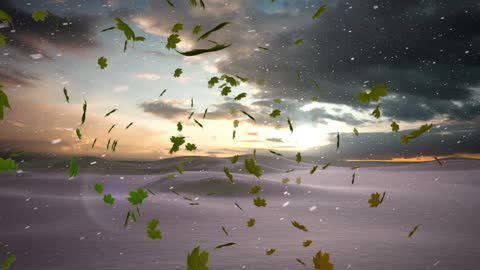 This visually captivating artwork features a dreamlike animation of leaves swirling in the air above a snowy landscape with snowflakes falling under a colorful sunset sky. It conveys the beauty of nature and the transition between seasons. Ideal for use in artistic projects, seasonal greeting cards, environmental presentations, and creative visual content celebrating the blend of autumn and winter.