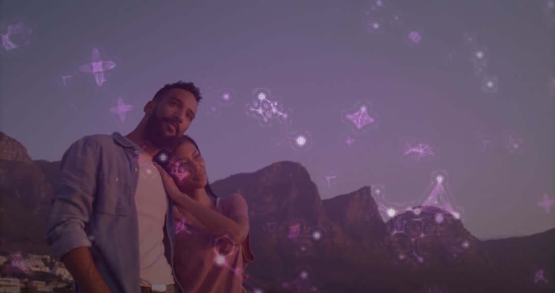 Romantic video clip features a couple standing serenely against majestic mountains at dusk, immersed in an overlay of purple molecular patterns drifting upward. Perfect for projects emphasizing the interplay of nature and technology, romantic getaways, or dreamy sequences of adventure and tranquillity. Ideal for use in promotional videos, romantic themes, travel content, and futuristic edits highlighting relationships and innovation.