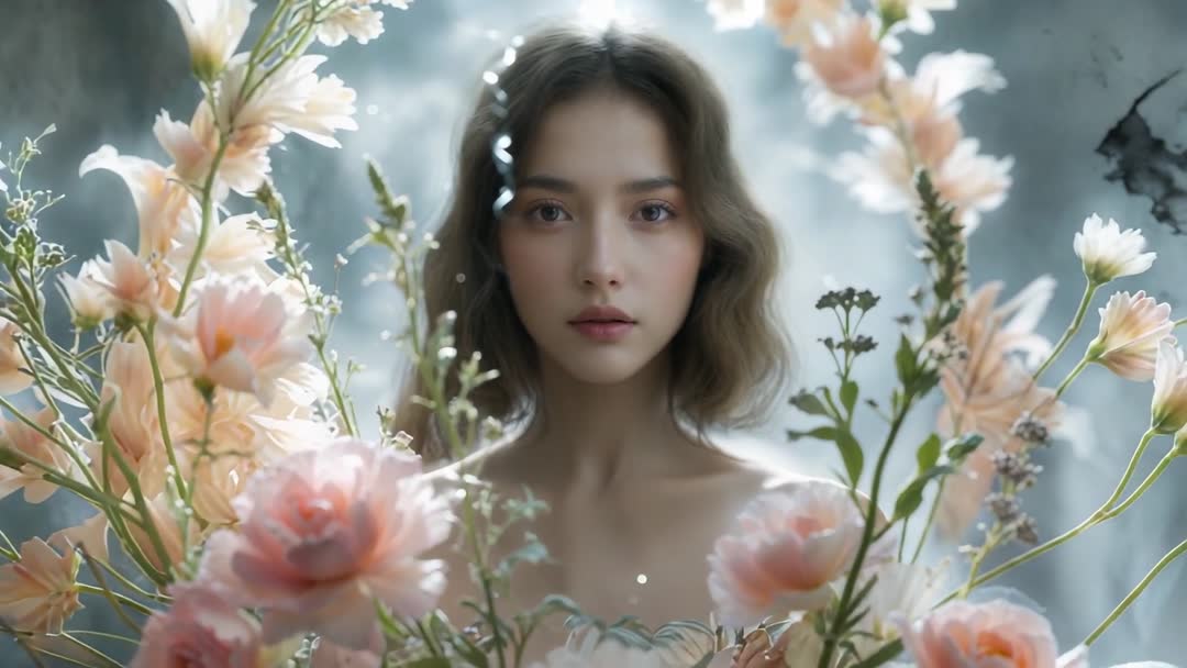 AI Generated Image. This composition captures a woman enveloped in a wreath of delicate, pastel-colored flowers while gentle sparkles add an ethereal effect. Ideal for promotional materials or publications focusing on beauty, nature, serenity, or artistic expression, evoking feelings of tranquility and elegance.