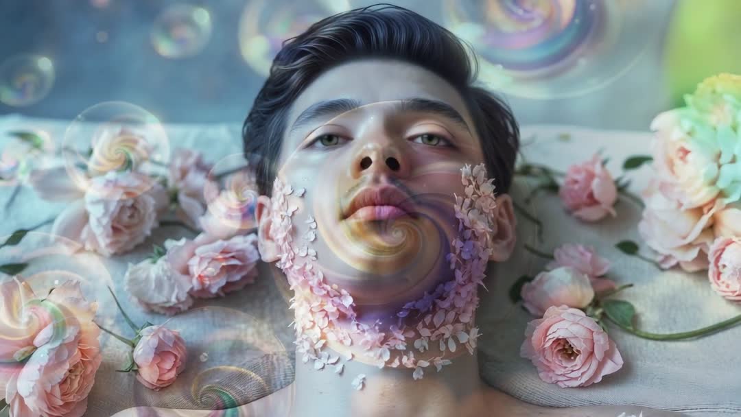 AI Generated Image. Captures essence of tranquility and dreamlike state. Ideal for use in wellness promotions, relaxation materials, spa treatments, and design projects conveying calmness or creativity. Synthesized features add surreal, futuristic feel.