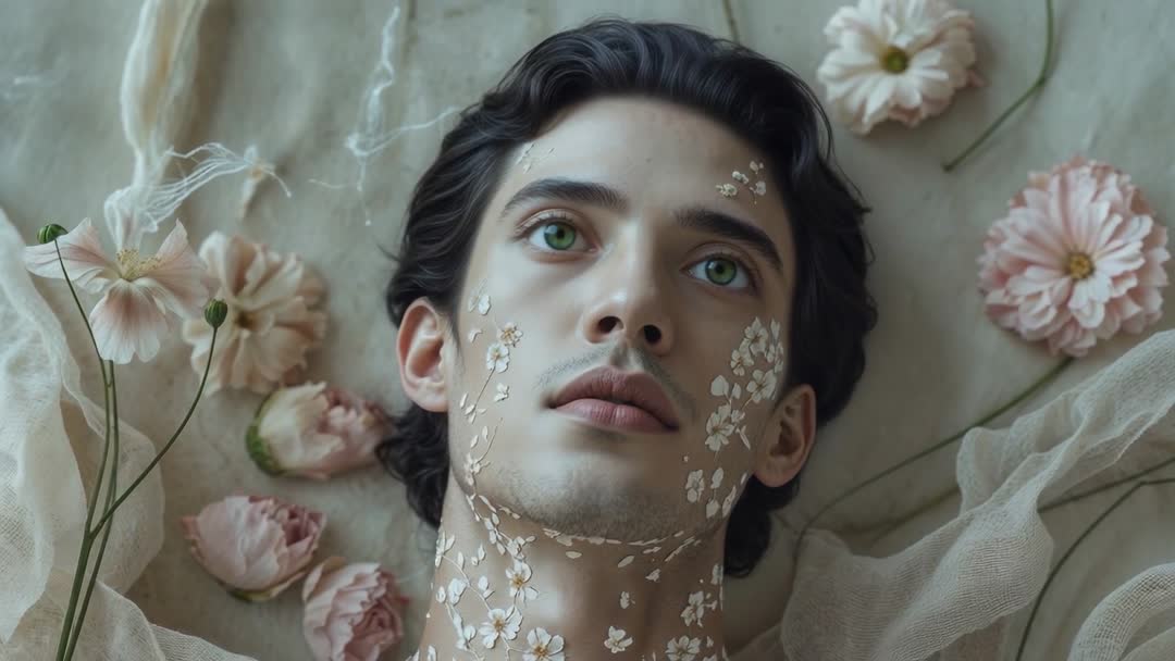- Dreamy Male Face with Delicate Floral Accents and Natural Expression