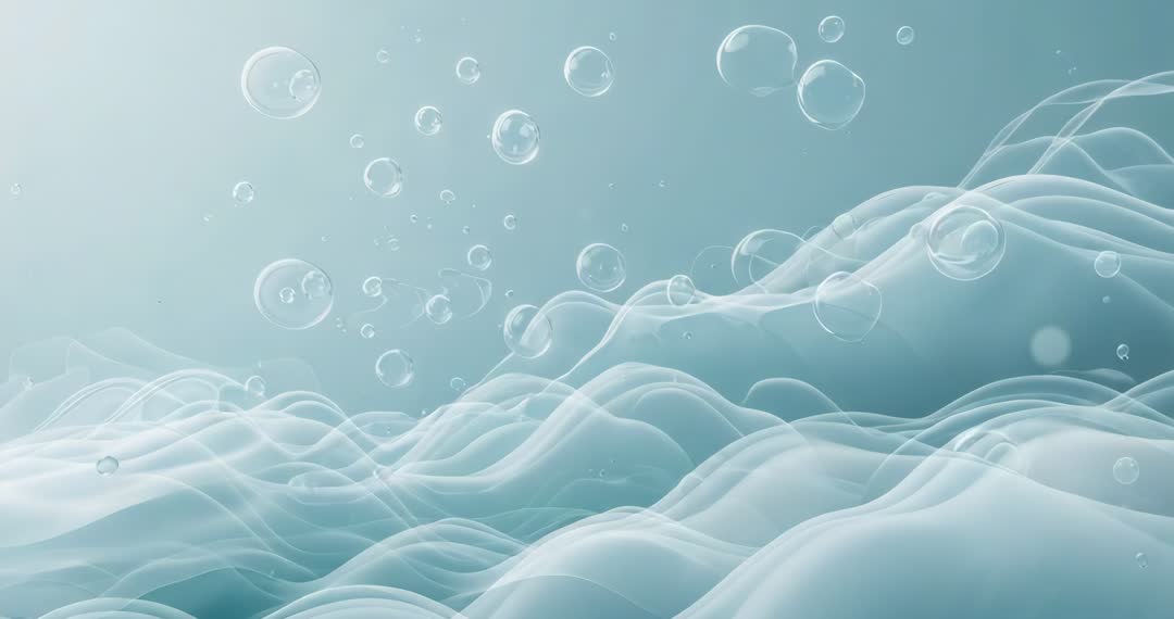 AI Generated Image. In this evocative scene, waves are gracefully undulating while translucent bubbles drift blissfully upward on a pale blue background. This harmonious and ethereal visual captures the essence of calm and fluidity often associated with tranquil aquatic environments. The abstract nature of the visuals, resembling a mix of surrealism and digital watercolors, grants an artistic and soothing touch, offering an engaging experience into imaginative realms. Utilization suggestions include contexts for generating calm and focus in workspaces, supporting content on introspection or narratives conveying dreamy, aquatic themes. This conceptual sequence beautifully achieves the perfect balance for any editorial or marketing endeavor exploring themes of calmind fluidity.