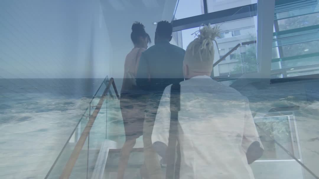 Conceptual depiction of a relaxing and transformative movement, where individuals walking upstairs blend seamlessly with tranquil scenes of ocean waves and sky. Compelling visual for themes encompassing journeys, feelings of peace amidst the chaos, integration of nature and human activities. Ideal usage includes campaigns about relaxation, travel and interior or architectural promotions illustrating closeness to nature.