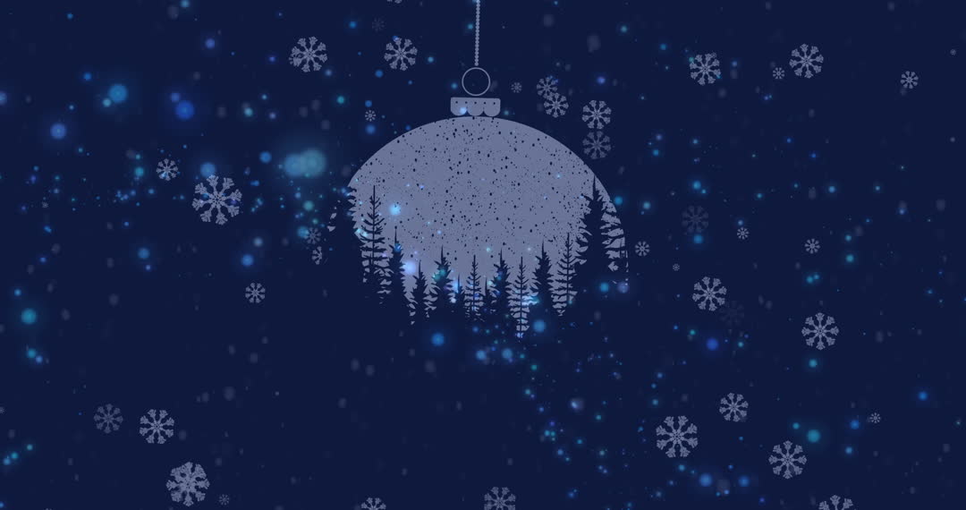 Illustration features a winter forest with snow-covered trees in an ornament design. Snowflakes gently fall against a deep blue background, creating a relaxing ambiance. Ideal for holiday-themed graphics, winter celebrations, social media posts during Christmas, or festive advert design.
