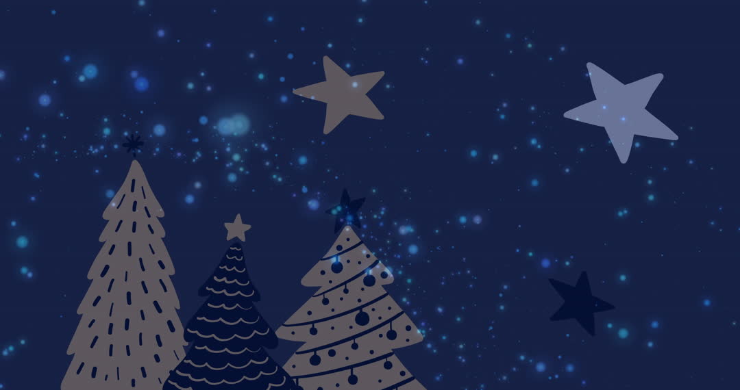 Illustration shows snowflakes floating down across a starry night with painted Christmas trees suggestive of festive celebration. The animated render is perfect for use in holiday greeting cards, social media banners or festive themed videos.