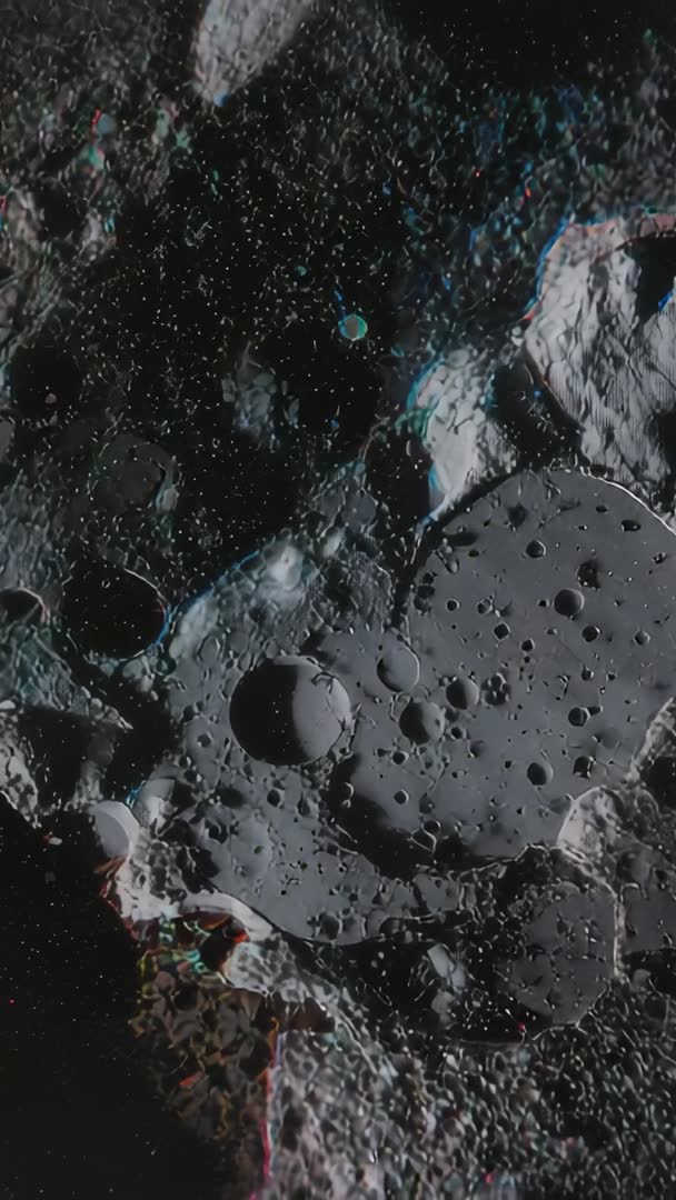 AI Generated Image. Drifting camera revealing heavily cratered lunar landscape while teal dot appears against chromatic starfield. High-contrast textures and deep shadows adding sense of depth and scale across rugged regolith and crater rims. Ideal for sci-fi trailers, space documentary sequences, tech and gaming intros, app backgrounds, and vertical social media stories. Loopable motion and cinematic color palette fitting for title sequences, ambient displays, and visual effects compositions. Providing versatile clip for editorial, commercial, and broadcast use with potential for color grading, slow-motion edits, and layered VFX integration.