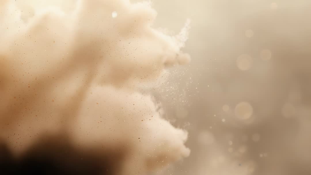 AI Generated Image. Clip showing drifting beige plume moving across frame with fine floating dust particles and soft bokeh highlights. Macro perspective revealing delicate texture, diffusion, and subtle grain in warm neutral tones. Gentle backlighting creating luminous glow and layered depth, particles catching light and floating. Footage working well for cinematic backgrounds, title sequences, lower thirds, product reveals, and mood reels. Serving as atmospheric transition, VFX overlay, dust texture, and mood enhancer for promos, ads, and social media content. Blending using screen or overlay modes, applying color grade and slow-motion for dramatic effect. Loop-friendly for ambient backgrounds and stage projection.