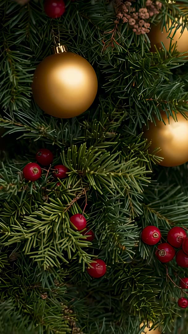 AI Generated Image. Vertical video showing drifting camera passing through lush evergreen wreath decorated with matte gold baubles, bright red berries, and scattered pinecones. Tight macro framing and warm lighting creating cozy holiday mood while highlighting texture of needles and sheen of ornaments. Useful for social media content such as Instagram Reels, TikTok, and Snapchat Stories, as well as mobile ads, storefront promos, holiday greeting backgrounds, ecommerce banners, and seasonal blog headers. Suitable for looping background, overlaying text or logos, adding gentle music or ambient sound, and cutting into shorter clips for product marketing. Color palette works with gold, deep green, and red schemes. Recommend slow speed playback for tranquil effect and subtle crop for portrait or square formats.