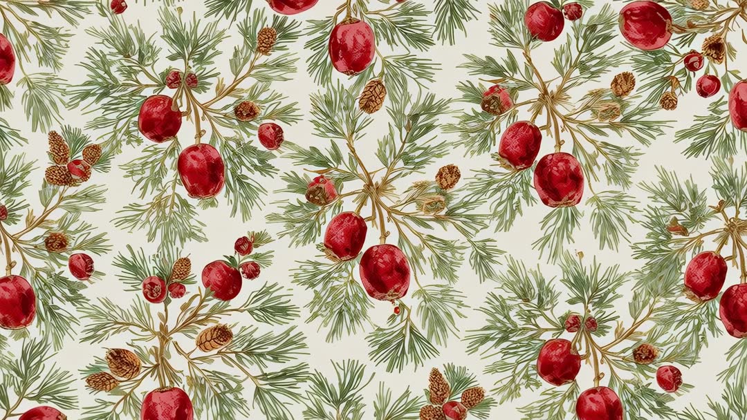 AI Generated Image. Video showing camera drifting across vintage botanical textile featuring pine needles, cones, glossy red berries on cream background. Pattern repeating seamlessly, offering slow calming pan ideal for product displays, website hero banners, holiday campaign backdrops, fabric design previews, packaging mockups. Texture conveying hand-drawn watercolor and ink detail, supporting print-on-demand, wallpaper collections, wrapping paper, stationery, mood boards. Color palette blending soft green, warm brown, festive red, making clip suitable for Christmas, winter, natural-themed projects. Looping option supporting social media reels, online store hero loops, digital signage. Recommend high-resolution export and optional color correction for print production.