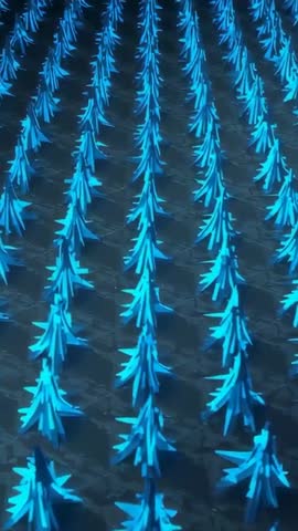 AI Generated Video. Vertical video showing drifting camera revealing repeating rows of cyan miniature trees arranged on dark textured tabletop. Stylized columnar tree models creating strong diagonal perspective and rhythmic pattern reading well in portrait format. High-contrast blue palette producing modern, slightly futuristic mood. Use for background loops, social media reels, app splash screens, holiday or winter-themed promos, title reveals, motion graphic overlays, and product display sequences. Edit by looping clip for seamless background, applying subtle speed ramps for dramatic reveal, or color grading to match brand palette. Suitable for designers, content creators, agencies, and advertisers seeking minimal, abstract nature visuals in vertical format.