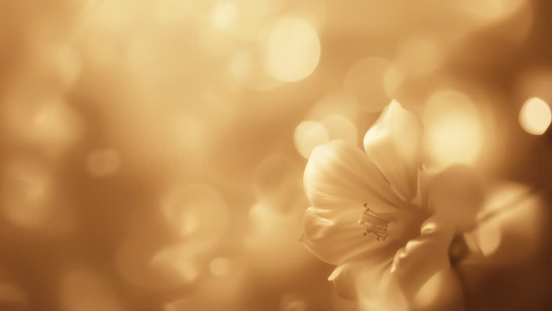 AI Generated Image. Video capturing drifting camera bringing golden blossom into sharper macro focus while background bokeh glowing. Soft backlight and warm golden tones creating romantic, dreamy mood with shallow depth and ample left-hand copy space. Suitable for wedding video openers, beauty and skincare product ads, floral shop social media reels, mindfulness and relaxation app backgrounds, and website hero banners. Clip working well as slow-motion loop, overlay transition, or ambient background behind text and logo. Suggested editing workflow: gentle color grade toward warm amber, subtle vignette for added focus, and crop for 16:9 hero or vertical story formats. License-friendly stock clip for commercial and editorial projects needing calm, elegant floral visuals.