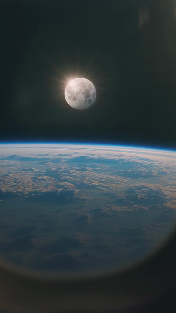 AI Generated Image. Vertical 9:16 video showing Moon moving above Earth's blue limb with sunlight flare and partial spacecraft window frame, camera drifting slowly for cinematic orbital pan. Scene providing stark contrast between black space and soft blue atmosphere, with cloud texture on planet surface. Usage suggestions: - Using as opening shot for space documentaries, astronomy segments, science education videos - Using as vertical hero for social media stories, TikTok, Instagram Reels, mobile app backgrounds - Using as B-roll for aerospace campaigns, technology ads, museum or planetarium displays - Using as loopable background for title sequences, meditation or ambient visuals Editing tips: - Leaving top area clear for headline text and bottom area for captions - Applying subtle color grade and slow zoom to enhance cinematic feel - Adding soft ambient or orchestral soundtrack for emotional impact Technical notes: Vertical 9:16 composition, window frame adding depth, ideal for mobile-first projects and short-form storytelling