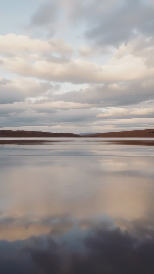 - Drifting clouds mirroring on calm lake at sunrise over low hills, vertical video